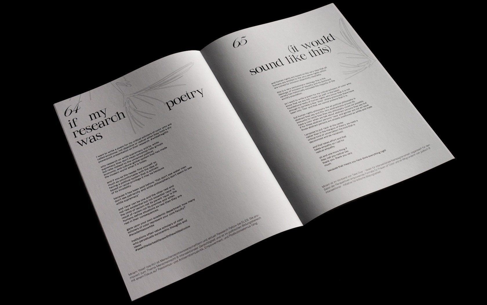 In unserer ersten Ausgabe findet ihr Gedichte, wissenschaftliche Essays, Prosa, einen Musikmix, Fotosstrecken und Illustrationen zu Themen wie queerem Begehren, Rassismuserfahrungen, Langeweile oder kolonialer Raubkunst.